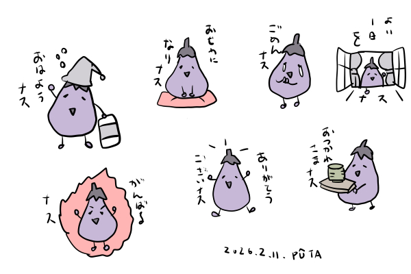 オリジナル生き物のメルメルで進めていたラインスタンプですが、トップの自己紹介に貼っているナスが良いとの声があったので、ナスで素振りしてみた。